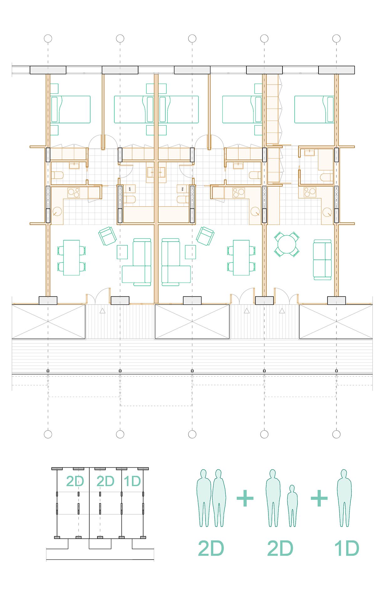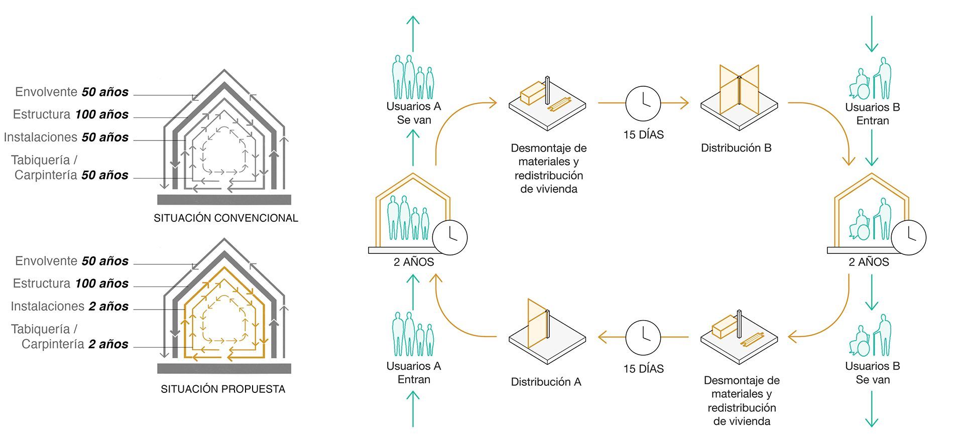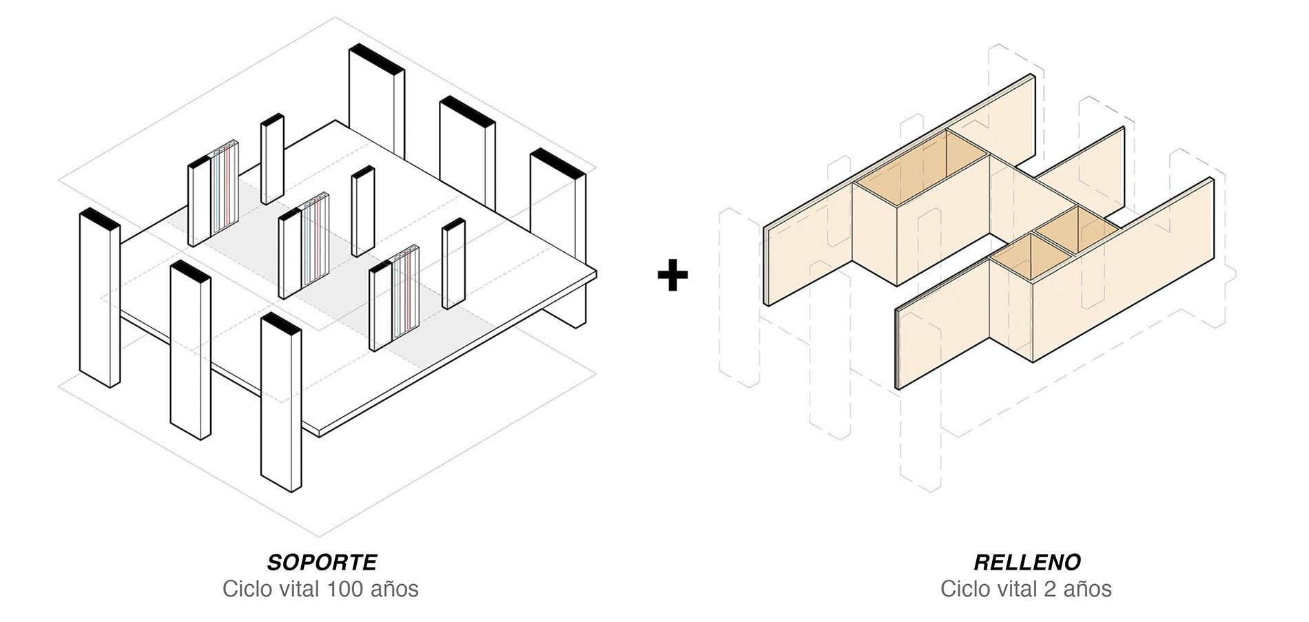 - Programa: se propone un programa residencial pensado específicamente para ser modificado en el tiempo, permitiendo adaptar el edificio a las necesidades demográficas de cada momento.