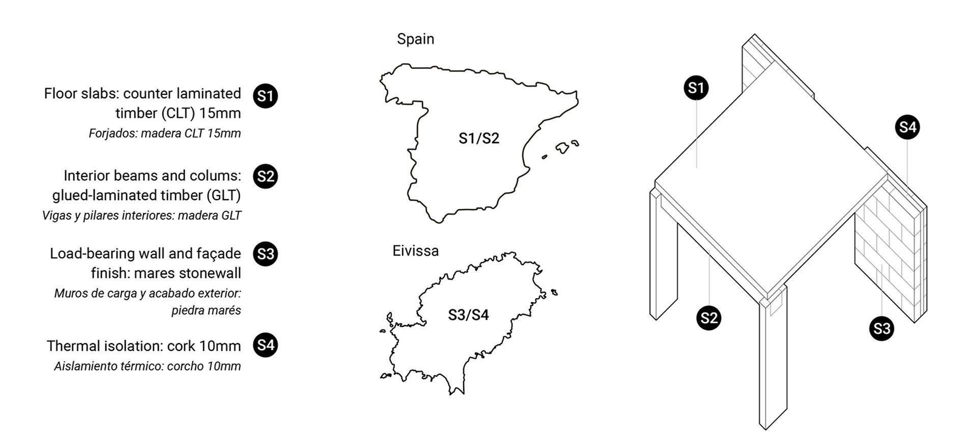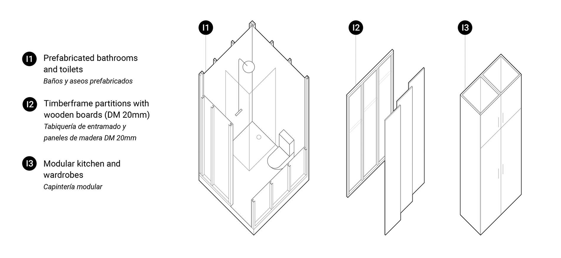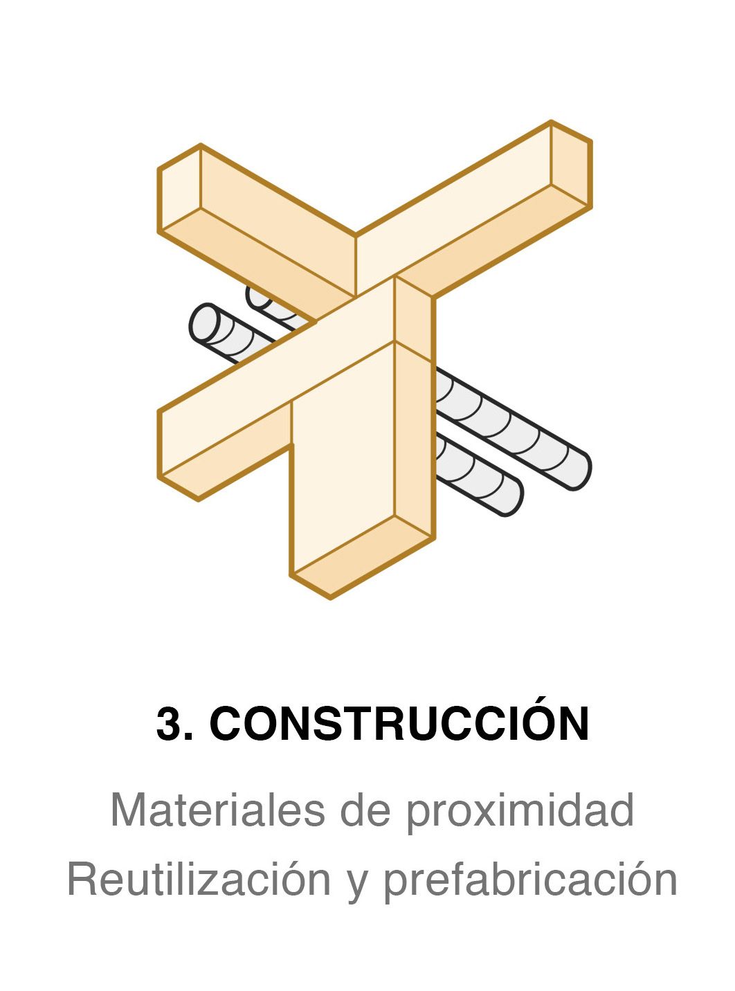 - Construcción: se definen los materiales y sistemas constructivos necesarios para limitar al máximo la huella energética y material del edificio, tanto en su primera construcción como en la sucesivas modificaciones planteadas en el tiempo.